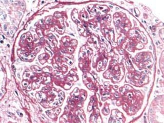 El documento resume las características clínicas, histológicas y de tratamiento de varias enfermedades glomerulares. El 80% de los casos de síndrome nefrótico en niños se debe al síndrome nefrótico idiopático, mientras que en adultos es más común la enfermedad membranosa. La enfermedad por depósito de IgA es más frecuente y grave en personas de raza negra. El pronóstico es desfavorable en casos con proteinuria masiva, hipertensión arterial e insuficiencia renal.