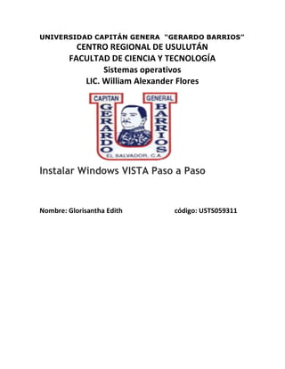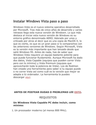 Este documento proporciona instrucciones paso a paso para instalar Windows Vista en un computador. Explica los requisitos mínimos para instalar Vista, como un procesador de 800 MHz y 512 MB de RAM. Luego, detalla los 22 pasos para completar la instalación, que incluyen introducir el DVD, seleccionar el idioma y la partición, y completar la configuración inicial después de reiniciar. Finalmente, indica que Windows realizará pruebas para optimizar la configuración para ese equipo en particular.