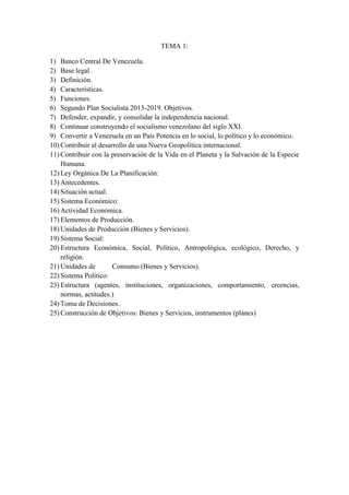 Este documento presenta un glosario de términos relacionados con finanzas e impuestos discutidos en un curso impartido por la Universidad Experimental Simón Rodríguez. Incluye definiciones de entidades como el Banco Central de Venezuela, la Ley Orgánica de Planificación, y objetivos del Segundo Plan Socialista como fortalecer la independencia nacional y convertir a Venezuela en una potencia. El glosario provee referencias para cada término cubierto en el curso.