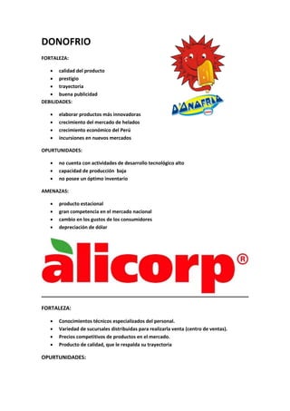 El documento describe las fortalezas, oportunidades, debilidades y amenazas de Gloria. Las principales fortalezas incluyen su posición de liderazgo en el mercado de leche, diversificación geográfica, capacidad de innovación y apoyo a la ganadería lechera. Las principales oportunidades son la diversificación de ventas, aumento del consumo de productos lácteos y acceso a nuevos mercados. Las debilidades clave son la falta de poder de negociación de los productores y problemas en el manejo del ganado lechero. Las