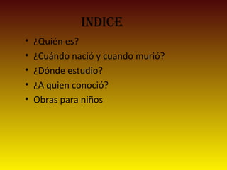 Gloria Fuertes fue una gran escritora española de libros y poemas para niños. Nació en Madrid en 1917 y murió en 1998. Escribió obras sobre animales, seres inventados, personas y mundos al revés. Algunos de sus poemas más conocidos son "El hombre que sabía volar" y "El gato garabato".