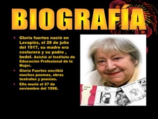 Gloria Fuertes nació en Madrid en 1917 y trabajó como maestra. Escribió muchos poemas, obras teatrales y poesía para niños. Algunas de sus obras más conocidas incluyen "El camarón cojito", "¿Dónde vas carpintero?" y "La vaca llorona". Fuertes falleció en 1998 después de tener una prolífica carrera como poetisa.