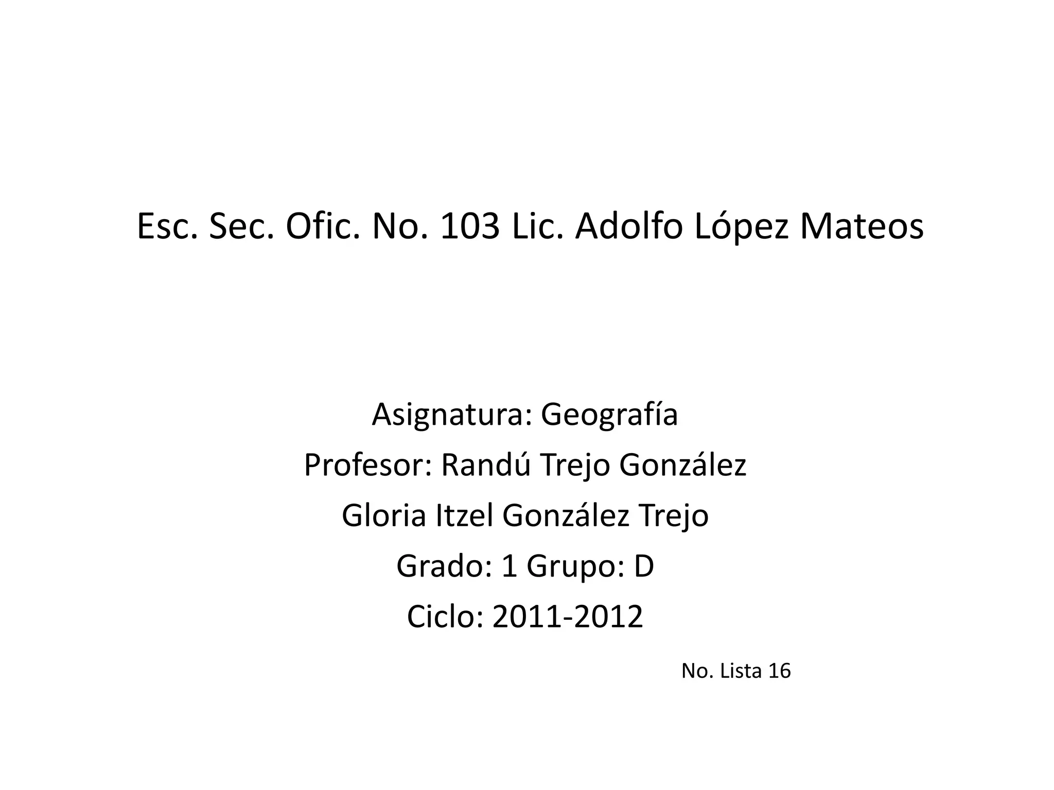 Este documento es un reporte escolar de la asignatura de Geografía para el primer grado del grupo D durante el ciclo escolar 2011-2012. El profesor es Randú Trejo González y la alumna es Gloria Itzel González Trejo.