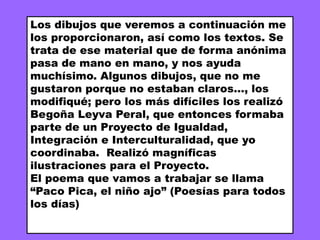 Este documento presenta un poema llamado "Paco Pica, el niño ajo" de Gloria Fuertes, junto con ilustraciones que lo acompañan. El poema trata sobre un niño llamado Paco que es rechazado por sus compañeros debido a que huele a ajo, pero una niña llamada Cebolla se sienta a su lado. La maestra Cebolleta les enseña sobre la igualdad y la aceptación de todos. El autor concluye que este poema promueve valores como la compañería, la ayuda,