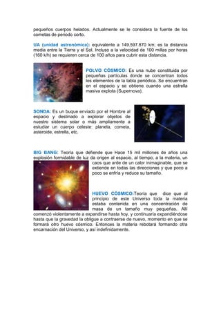 El documento presenta definiciones de varios términos relacionados con el sistema solar, el universo y la astronomía. Explica conceptos como sistema solar, cosmología, estrella, cometa, asteroide, cinturón de Kuiper, unidad astronómica, polvo cósmico, sonda, big bang, huevo cósmico, galaxia, satélite, planeta, viento solar, Vía Láctea, rover, atmósfera y constelaciones. También resume tres teorías sobre la formación de la vida.