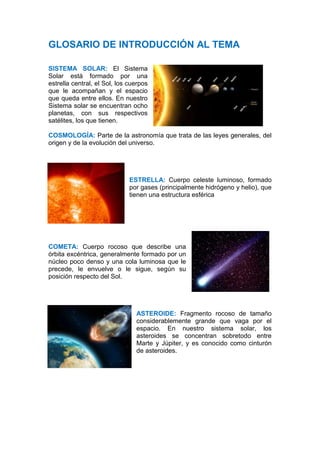 El documento presenta definiciones de varios términos relacionados con el sistema solar, el universo y la astronomía. Explica conceptos como sistema solar, estrellas, planetas, cometas, asteroides, galaxias y teorías como el Big Bang y la formación de la vida.