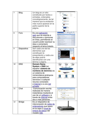 Este documento presenta una lista de términos relacionados con la computación, la antropología, el inglés y sus definiciones. Incluye 30 entradas sobre conceptos de computación, 43 sobre antropología, 15 sobre el idioma inglés y sus funciones gramaticales. El glosario provee definiciones concisas de una variedad de términos técnicos y conceptos culturales.