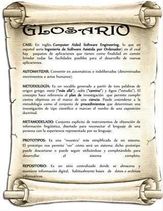 Este documento presenta un glosario de términos relacionados con la ingeniería de software como parte de la asignatura "Fundamentos de Ingeniería de Software" del Instituto Tecnológico de Tuxtepec. El glosario define términos como CASE, automatizar, metodología, metamodelado, prototipos, repositorio, reingeniería, depuración, elicitudación, pseudocódigo e interfaz.