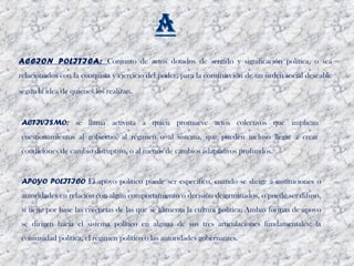 El documento presenta definiciones de varios conceptos políticos clave como acción política, activismo, apoyo político, bien común, burguesía, bipartidismo, cadena de mando, capitalismo, comunismo, democracia real, descentralización política, eficacia y eficiencia, elecciones, estado, factores de poder, función política, freno político, golpe de estado, gobierno como dirección, grupos de presión, habilidad política, hábitos de los pueblos, hábitos de obediencia, identidad política, inflación, impuesto