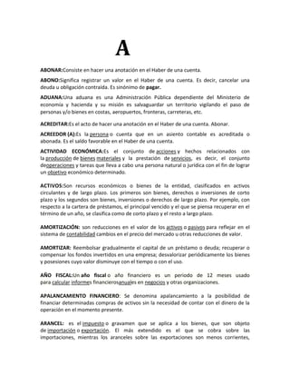 El documento proporciona definiciones de varios términos contables y financieros. Algunos de los términos definidos incluyen cuenta haber y debe, activos, pasivos, capital contable, balance general, cheque, conciliación bancaria, compra, venta y otros conceptos básicos de contabilidad.