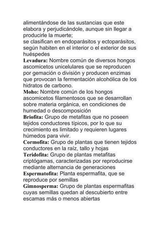 Este glosario define términos relacionados con plantas, hongos y sus estructuras reproductivas. Explica conceptos como flor, hongo, polinización, micelio, esporangio, levadura y moho. También define las partes de las plantas como estigma, estilo, ovario y óvulo, así como los órganos reproductivos masculinos y femeninos como pistilo, carpelo, gineceo, antera y estambre.