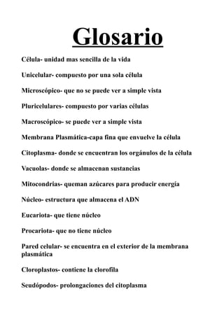 Este glosario define términos clave relacionados con las células, incluyendo las diferencias entre células unicelulares y pluricelulares, eucariotas y procariotas, y describe las principales estructuras celulares como la membrana plasmática, citoplasma, núcleo, vacuolas, mitocondrias, cloroplastos, y los tipos de movimiento celular. También define bacterias y virus.