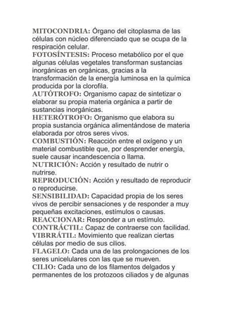Este documento proporciona definiciones de términos clave relacionados con la biología celular y los microorganismos. Define conceptos como célula, microorganismo, microscopio, membrana, citoplasma, núcleo y orgánulos como las mitocondrias y los cloroplastos. También explica los procesos de fotosíntesis, nutrición y reproducción a nivel celular, así como los tipos de organismos autótrofos y heterótrofos. Define varios tipos de microorganismos unicelulares como bacterias