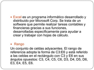 Excel es un programa de hojas de cálculo desarrollado por Microsoft que permite realizar tareas financieras y de contabilidad. Un libro de Excel contiene hojas de cálculo compuestas de filas, columnas y celdas. Las fórmulas permiten realizar cálculos matemáticos utilizando valores de celdas y funciones.