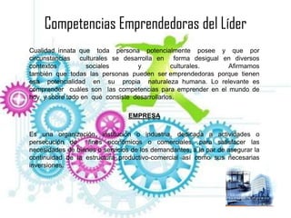 Este documento describe las características y competencias de un líder emprendedor. Explica que los líderes empresariales se hacen, no nacen, y requieren conocimiento, habilidades, actitudes y comportamientos específicos. Detalla varias características clave de los líderes emprendedores como la pasión, visión, determinación, creatividad e innovación. Además, define conceptos como competencia, inteligencia y liderazgo.