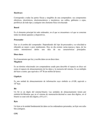 Este documento proporciona definiciones de varios términos técnicos relacionados con hardware de computadoras e incluye explicaciones de componentes como chipset, interfaz, joystick, USB, monitor, elementos de entrada y salida, hardware, placa base, procesador, disco duro, megabyte, gigabyte, bit, byte, CPU, mouse, teclado, memoria, socket, impresora, CD, DVD, bus de datos, fuentes, ranura de expansión, corriente, voltaje y puerto.
