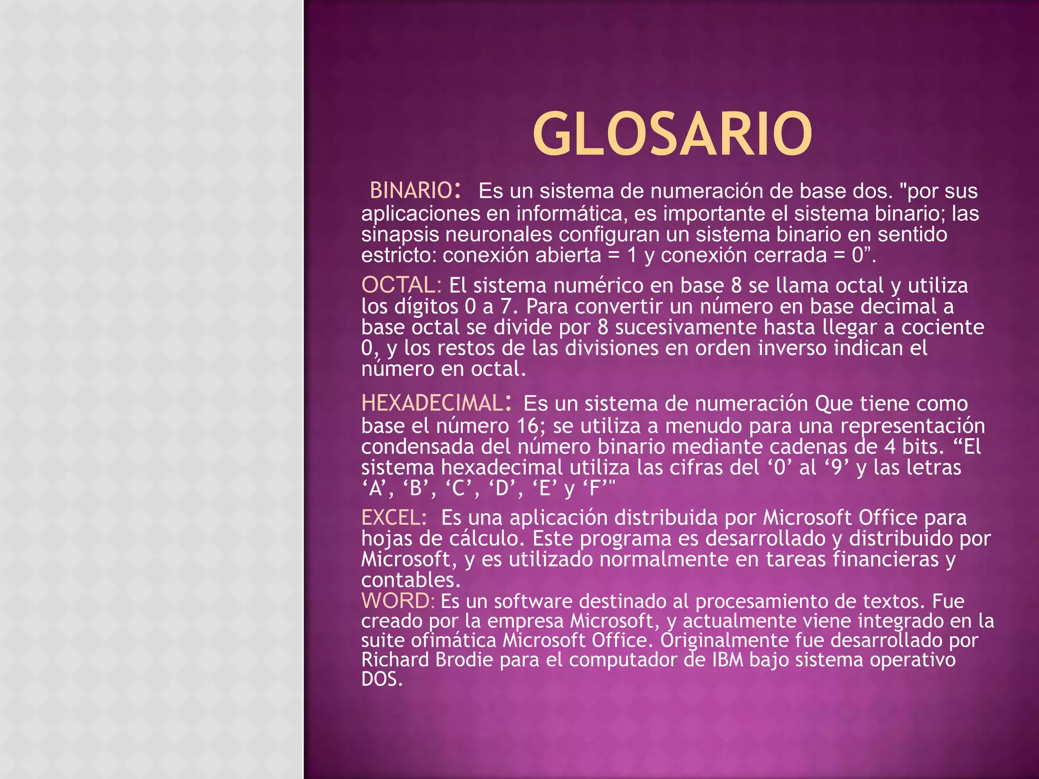 Los documentos describen diferentes sistemas de numeración como binario, octal y hexadecimal, así como programas comunes como Excel, Word y PowerPoint. También se mencionan conceptos informáticos clave como hardware, software, memoria RAM y unidades de almacenamiento. Finalmente, se describen algunas herramientas en línea como DropBox, SlideShare y Calameo.