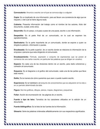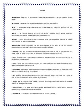El documento provee definiciones de varios términos relacionados a la elaboración de documentos y comunicaciones escritas. Explica conceptos como abreviatura, acrónimo, acta, anexo, asunto, bibliografía, capítulo, cargo, entre otros. En total, define más de 50 términos diferentes.