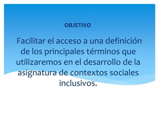 Este documento presenta definiciones clave de términos relacionados con la inclusión educativa como adaptaciones curriculares, comunidad, currículo inclusivo, derecho, diversidad, discapacidad, docente del aula regular, estrategias pedagógicas, estudiantes con necesidades educativas especiales, escuela, inclusión, redes sociales comunitarias, pedagogía, trabajo colaborativo y vulnerabilidad. Además, incluye enlaces web relacionados con necesidades educativas especiales, discapacidad y estrateg