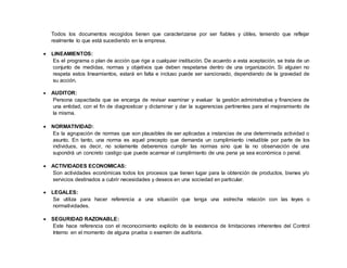 El documento define términos clave relacionados con las auditorías de estados financieros de acuerdo con las Normas Internacionales de Auditoría (NIA), incluyendo términos como auditoría, NIA 200, estados financieros, auditor, entidad, riesgos de auditoría y administración. Explica que la NIA 200 establece las responsabilidades globales del auditor independiente al realizar una auditoría de conformidad con las NIA y que las NIA son el conjunto de cualidades y procedimientos que debe seguir un auditor para brindar un trabajo de calidad.