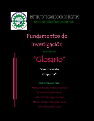 Este documento presenta un glosario de términos de puntuación y estilo escrito compilado por un grupo de estudiantes para su clase de fundamentos de investigación. El glosario define signos de puntuación como la sílaba, el hiato, el diptongo, los puntos suspensivos, los dos puntos, el punto y coma, la raya o guion largo, los paréntesis y las comillas. También explica conceptos como el guión, el punto, la coma, los conectores y cualidades como la claridad, la sencillez