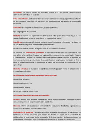 El documento define objetos de aprendizaje como entidades digitales desarrolladas para generar conocimiento, habilidades y actitudes requeridas para una tarea. Explica que los objetos de aprendizaje tienen propiedades como subjetividad, realidad, historicidad, complejidad y comunicabilidad. Además, describe los componentes de los objetos de aprendizaje como unidades de información, contenido y didácticas, y los elementos necesarios para su identificación como prerequisitos, objetivos, actividades y recursos. Finalmente, explica varios estándares y especific