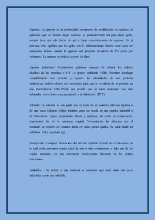 El documento proporciona definiciones breves de varios términos biomédicos clave. Incluye definiciones de Acetil CoA, un compuesto intermediario clave en el metabolismo; Acetilcolina, un neurotransmisor; y ADN, el ácido desoxirribonucleico que contiene la información genética. También define términos como Acrosoma, Acuaporinas, Agarosa y Agentes reductores.