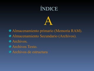 El documento resume los conceptos básicos de almacenamiento de datos, archivos, bases de datos y procesamiento de información. Describe el almacenamiento primario (memoria RAM) y secundario (archivos), y define los tipos de archivos como texto y de estructura. Explica los componentes de una base de datos como tablas, registros y campos, y los diferentes tipos de datos como alfabéticos, numéricos, fecha/hora y lógicos. Finalmente, define la información, la interacción entre los componentes de una base de datos, y el pro