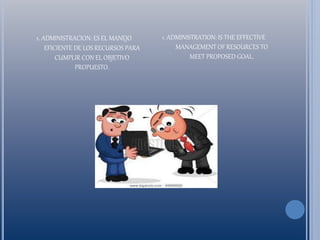 Este documento proporciona definiciones de 25 términos clave relacionados con la administración. Los términos incluyen conceptos como administración, alianzas estratégicas, auditoría, autoridad, capital, costos, cultura organizacional, dirección, eficiencia, estrategia, finanzas, liderazgo, metas, organización, planeación, presupuesto, supervisión y teoría. El documento proporciona una breve definición de uno o dos oraciones para cada término.