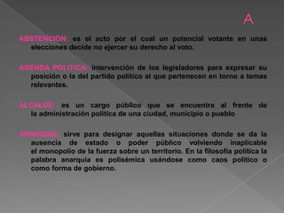 Este documento contiene definiciones de más de 50 términos relacionados con la política y el gobierno. Algunos de los términos definidos incluyen democracia, dictadura, partido político, presidente, elecciones, ley y derechos ciudadanos. El documento proporciona información concisa sobre conceptos políticos fundamentales.