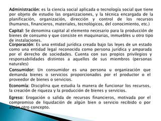 Economía: Disciplina queestudia la manera de funcionar los recursos, la creación de riqueza y la producción de bienes y servicios. Capital: Se denomina capital al elemento necesario para la producción de bienes de consumo y que consiste en maquinarias, inmuebles u otro tipo de instalaciones. Egreso: Erogación o salida de recursos financieros, motivada por el compromiso de liquidación de algún bien o servicio recibido o por algún otro concepto. Corporación: Es una entidad jurídica creada bajo las leyes de un estado como una entidad legal reconocida como persona jurídica y amparada por el derecho de sociedades. Cuenta con sus propios privilegios y responsabilidades distintos a aquellos de sus miembros (personas naturales) Administración: es la ciencia social aplicada o tecnología social que tiene por objeto de estudio las organizaciones, y la técnica encargada de la planificación, organización, dirección y control de los recursos (humanos, financieros, materiales, tecnológicos, del conocimiento, etc.) Consumidor: Un consumidor es una persona u organización que demanda bienes o servicios proporcionados por el productor o el proveedor de bienes o servicios.