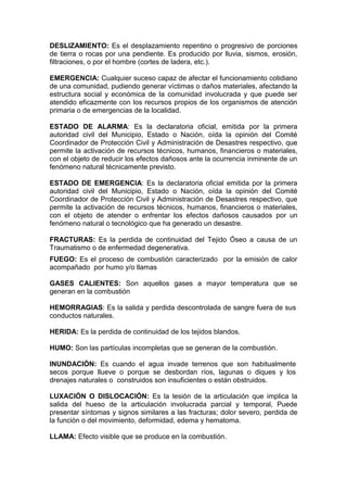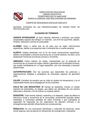 Este documento proporciona definiciones clave de términos relacionados con la seguridad escolar y la protección civil. Define más de 30 términos como agente extinguidor, alarma, alerta, amenaza, autoprotección, calor, ciclo de los desastres, desastre, desalojo, deslizamiento, emergencia, estado de alarma, estado de emergencia, fracturas, fuego, gases calientes, hemorragias, herida, humo, inundación, luxación o dislocación, llama, mapa de riesgo