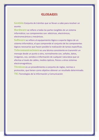 El documento presenta definiciones breves de los siguientes términos clave: gestión, hardware, software, telecomunicaciones, técnicas y TIC. Define gestión como los trámites para resolver un asunto, hardware como las partes tangibles de un sistema informático, y software como el soporte lógico. También define telecomunicaciones como la transmisión de mensajes entre puntos, técnicas como procedimientos para obtener resultados, y TIC como tecnologías de información y comunicación.