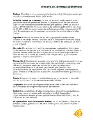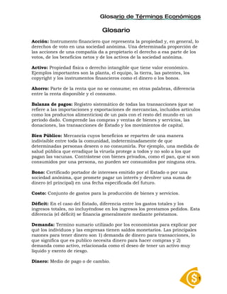 Este documento presenta definiciones concisas de varios términos económicos clave como acción, activo, ahorro, balanza de pagos, bien público, bono, costo, déficit, demanda, dinero, divisas, inflación, liquidez, mercado, monopolio, oferta, oligopolio, pasivo, PEA, PIB, política fiscal, superávit y tasa de interés. El glosario proporciona una referencia útil de conceptos básicos de economía.