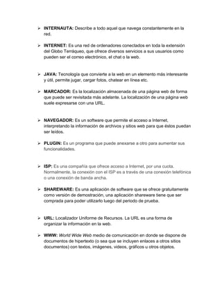 Este documento define y explica varios términos clave relacionados con Internet y la World Wide Web. Incluye definiciones de dirección IP, ancho de banda, backup, dominio, encriptación, freeware, FTP, HTML, HTTP, internauta, Internet, Java, marcador, navegador, plugin, ISP, shareware, URL, WWW, Web 2.0, podcast, Flickr, RSS, repositorio web y webmail. Además, explica tres formas de escribir el símbolo arroba (@) en un teclado.