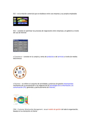 Este documento proporciona definiciones para varios términos relacionados con la gestión empresarial. Incluye definiciones breves para términos como BI, B2B, B2C, e-commerce, CRM, ERP, OLAP, SQL y más, con el objetivo de generar un glosario de términos para la gestión empresarial.