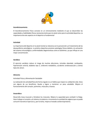 Este documento describe varios conceptos relacionados con la salud física y el deporte. Explica que el acondicionamiento físico y la actividad deportiva son importantes para la salud mental y física ya que previenen enfermedades y mejoran la concentración. También describe diferentes tipos de ejercicio como aeróbico, anaeróbico y conceptos como intensidad, frecuencia, nutrición, oxigenación y más. Resalta que la actividad física y el deporte influyen positivamente en la salud al prevenir riesgos y enfer