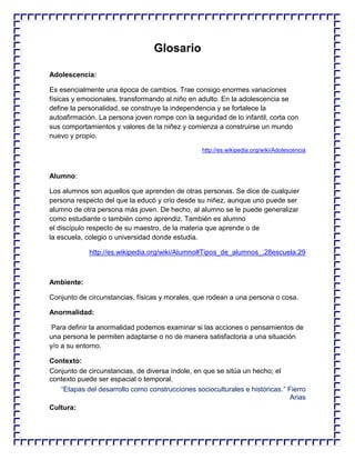 Este documento presenta definiciones de varios términos relacionados con el desarrollo infantil como adolescencia, alumno, ambiente, anormalidad, contexto, cultura, déficits, desarrollo humano, desarrollo psicológico, educabilidad, el desarrollo infantil, familia, genética, gradualidad, herencia, infancia, maduración, métodos de estudio del desarrollo, normalidad, periodo crítico, plasticidad, retraso mental y simultaneidad. Las definiciones provienen de fuentes como