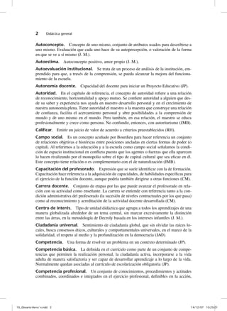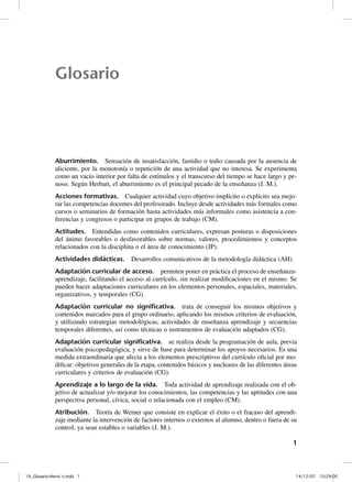 Este documento presenta definiciones de varios términos relacionados con la educación. Explica conceptos como aburrimiento, adaptación curricular, aprendizaje a lo largo de la vida, atribución, autoconcepto, autonomía docente, autoridad, calificar, competencia, competencia básica, competencia profesional, comunicación, comunidades de aprendizaje, conceptos, conciencia, conducta, confianza, conocimiento, contenidos didácticos, contexto de aprendizaje, creatividad, criterios de evaluación, cultura