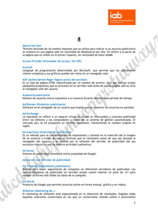 El documento es un glosario de términos de publicidad y marketing digital que define varios conceptos clave, como 'above the fold', 'ad words', y 'marketing de afiliación', entre otros. También explica modelos de pago como CPA, CPM y CPC, así como estrategias de analítica y seguimiento en campañas publicitarias. Proporciona información sobre herramientas y tecnologías utilizadas en el sector, incluyendo APIs, cookies y sistemas de gestión de contenido.