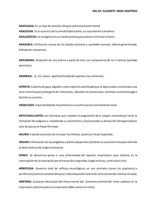 Este documento proporciona definiciones de más de 50 términos médicos comunes. Algunos de los términos definidos incluyen acromion, acrocianosis, afasia, albúmina, alopecia, anemia, angina, apósito, arritmia, asma, cánula de Guedel, cateterismo, cerumen, colestomía, cultivo, cuña y cutáneo. El documento parece ser un glosario médico elaborado por la Licenciada Elizabeth Mera Martínez para propósitos educativos.