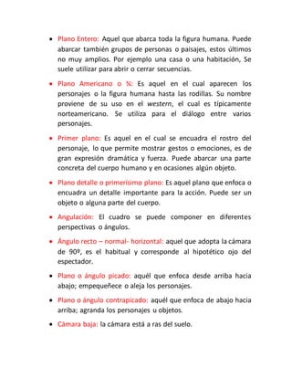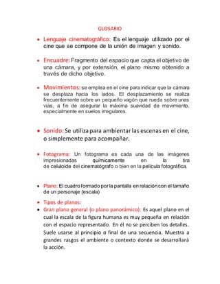 Este documento define los principales términos relacionados con el lenguaje cinematográfico, incluyendo encuadre, movimientos, sonido, fotogramas, planos y tipos de planos como plano general, plano entero, plano americano y primer plano. También explica conceptos como angulación, ángulo recto, plano picado y contrapicado.