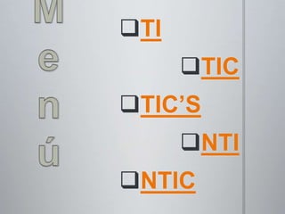 El documento habla sobre diferentes tipos de tecnologías de la información. Define profesionales TI como expertos relacionados con las tecnologías de la información que pueden realizar tareas como instalar aplicaciones, crear software y administrar sistemas. También explica que las tecnologías de la información y comunicación procesan, almacenan, sintetizan e información y las nuevas tecnologías de la información comprenden aplicaciones científicas para el tratamiento de la información.