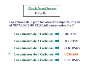 Los glúcidos son biomoléculas formadas por carbono, hidrógeno y oxígeno. Pueden clasificarse como monosacáridos, oligosacáridos o polisacáridos dependiendo del número de unidades básicas que los componen. Los monosacáridos son glúcidos simples constituidos por una sola unidad, mientras que los polisacáridos están formados por muchas unidades unidas mediante enlaces O-glucosídicos.