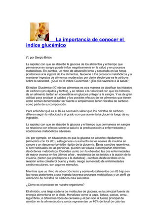 El documento explica el índice glucémico (IG) de los alimentos, que mide la velocidad con la que los hidratos de carbono de un alimento se convierten en glucosa y llegan a la sangre. Los alimentos con un IG bajo producen menores oscilaciones en los niveles de azúcar en la sangre, lo que beneficia la salud y el rendimiento deportivo. Conocer el IG de los alimentos permite planificar dietas más saludables ricas en alimentos con IG bajo como pastas, arroz, frutas y verduras