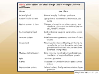 El documento describe los corticosteroides, incluyendo sus efectos en diferentes tejidos, mecanismos de acción, y usos clínicos y efectos adversos. Los corticosteroides son hormonas que incluyen glucocorticoides y mineralocorticoides, los cuales regulan procesos como el metabolismo, la inflamación y la homeostasis electrolítica. Se usan comúnmente para tratar condiciones inflamatorias y autoinmunes, aunque también tienen efectos adversos significativos.