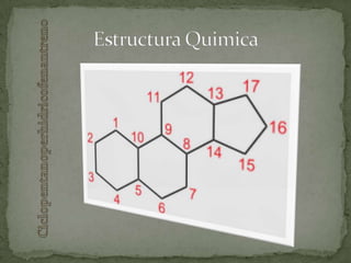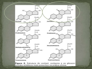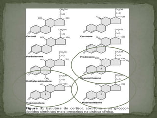 Este documento resume los efectos y usos de los glucocorticoides. Actúan uniéndose a receptores en el citoplasma y núcleo celular, lo que inhibe la producción de mediadores inflamatorios. Esto les da su efecto antiinflamatorio al inhibir enzimas y citocinas inflamatorias. También afectan el metabolismo de carbohidratos, proteínas y lípidos. Los efectos secundarios de tratamientos prolongados incluyen osteoporosis, fragilidad ósea, debilidad muscular y alteraciones electrolíticas. Se