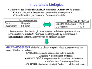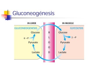 1) La gluconeogénesis es la síntesis de glucosa a partir de precursores no carbohidratos como el lactato, aminoácidos y glicerol. 2) Es un proceso crucial para mantener los niveles de glucosa en sangre durante períodos de ayuno cuando las reservas directas de glucosa se agotan. 3) Se lleva a cabo principalmente en el hígado y riñón a través de una serie de reacciones que convierten los precursores en glucosa de forma energéticamente favorable.
