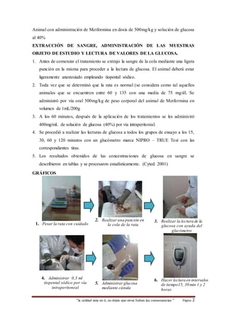 El documento describe un estudio realizado en ratas Wistar para determinar la eficacia de un medicamento llamado Neofarmina (metformina) en la reducción de los niveles de glucosa en la sangre. Se midieron los valores de glucosa en la sangre de las ratas antes y después de administrarles metformina y glucosa, observando una disminución progresiva de los niveles de glucosa con el paso del tiempo. Los resultados mostraron que la metformina fue efectiva en regular los niveles de glucosa en la sangre de las ratas.