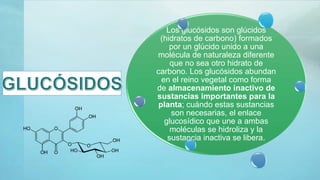 Los glucósidos son glúcidos unidos a otra molécula. Abundan en plantas como forma de almacenamiento inactivo de sustancias importantes. Los glucósidos incluyen salicina, arbutina, flavonoides y cardenólidos con diversos efectos como analgésico, antiséptico urinario y cardiotónico. Se encuentran en plantas como sauce, gayuba, digital y te de indias.